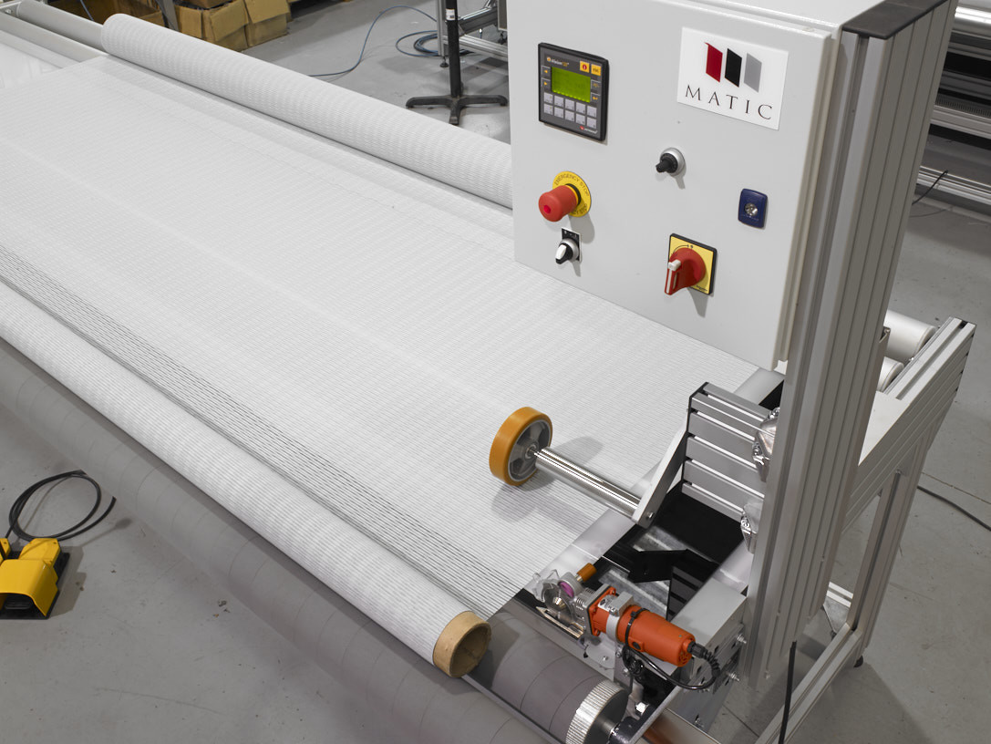 Machine for inspecting, measuring, winding and cutting fabric rolls.